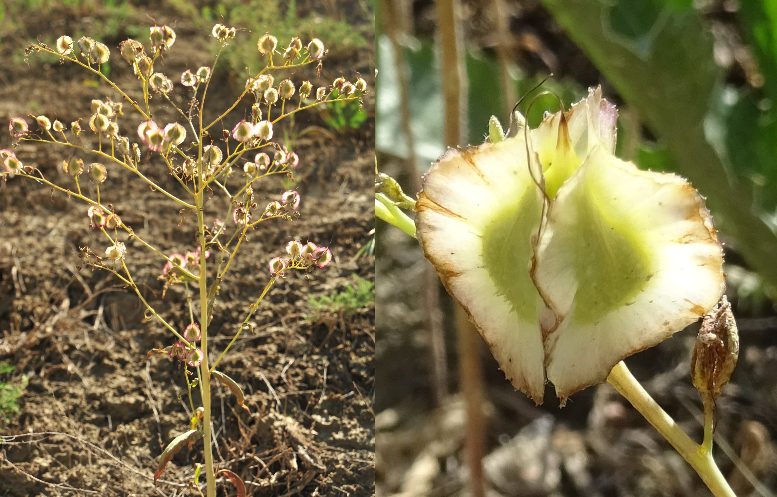 L’arrêt suivant se situe au sud de Vodopad, toujours près de la M41 et encore sur des éboulis grossiers. Le cortège d’espèces est plus riche, avec encore Ziziphora clinopodioides (32*), Eremurus fuscus (97*), Glaucium squamigerum (66*), mais également des taxons vus en 2022 comme Prunus armeniaca L., Phlomoides speciosa (81*, 82*), Dracocephalum integrifolium Bunge (84* ; PCPR021947, PCPR021949, PCPR021955 & PCPR021956), Linaria bungei Kuprian. (= L. transiliensis Kuprian. ; 85* ; PCPR021662), Ixiolirion tataricum (Pall.) Schult. & Schult. f. (photo 16) et à nouveau Rosa platyacantha vu la veille. Trois espèces retiennent particulièrement notre attention. La première est un arbuste du genre Atraphaxis (Polygonaceae), à feuilles orbiculaires plus ou moins obcordées ; il s’agit d’A. pyrifolia Bunge, nouvelle endémique d’Asie centrale (photo 17 ; PCPR021661). La deuxième est un pavot à pétales laciniés et tachés de noir en leur centre : Papaver laevigatum M. Bieb., espèce asiatique à aire plus large (PCPR021663). Enfin, un nouvel astragale est présent sur ces éboulis ; c’est une espèce de la section Dissitiflori DC., l’une des plus complexes du genre, qui est ici en fruits. C’est heureux car elle se caractérise par des fruits spectaculaires longs, fins et falciformes à l’apex. Notre plante est Astragalus fedtschenkoanus Lipsky (PCPR021849, PCPR021850 & PCPR021851).