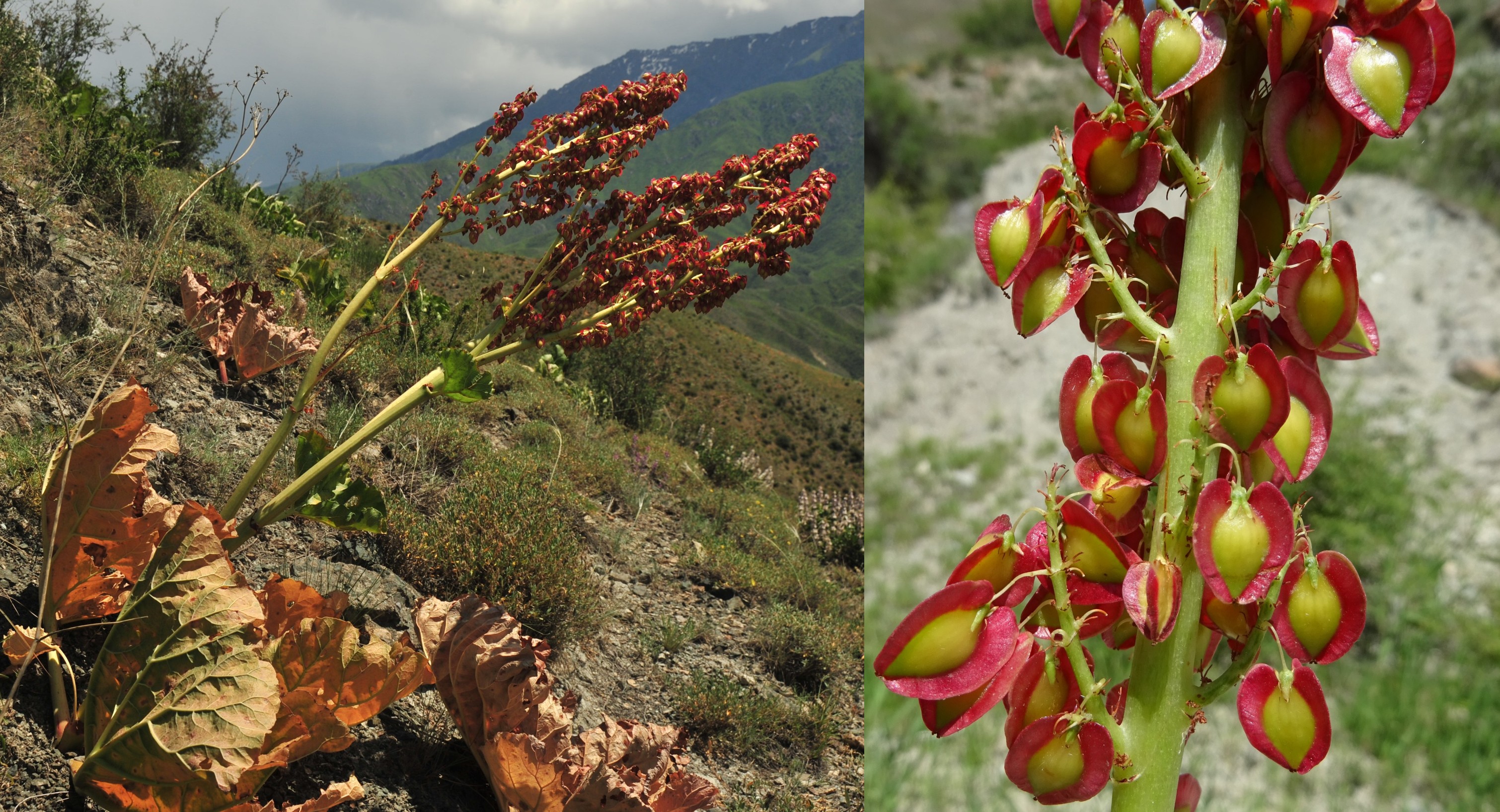 Notre route pour Tachkoumyr se poursuit dans de magnifiques paysages vallonnés, très secs et bien fleuris à cette époque. Nous descendons progressivement de 1 300 à 650 m d’altitude. Sur un coteau steppique surplombant la route entre le sud du lac de Toktogul et Karaköl (41° 41′ 53.1″ N, 72° 56′ 21.4″ E ; 1 333 m) Molucella olgae est très abondante et fleurie (PCPR021798 & PCPR021799). Avec elle une robuste polygonacée est en fruits ; c’est une rhubarbe à grands fruits, à ailes pourpre et à feuilles orbiculaires ou cordiformes, Rheum cordatum Losinsk. (planche 35 ; PCPR021797). Nous y trouvons également Inula grandis (en bas de coteau dans les zones fraîches), Helianthemum songaricum Schrenk (PCPR021796) et trois astragales. Le premier est l’annuel à large répartition asiatique Astragalus campylorrhynchus Fisch. & C.A. Mey., le deuxième est la plante de la section Chaetodon vue le matin, et le troisième est un taxon de la section Dissitiflori très rarement observé et endémique du Kyrghizistan, Astragalus bosbutooensis Nikitina & Sudn (PCPR021858 & PCPR021859).