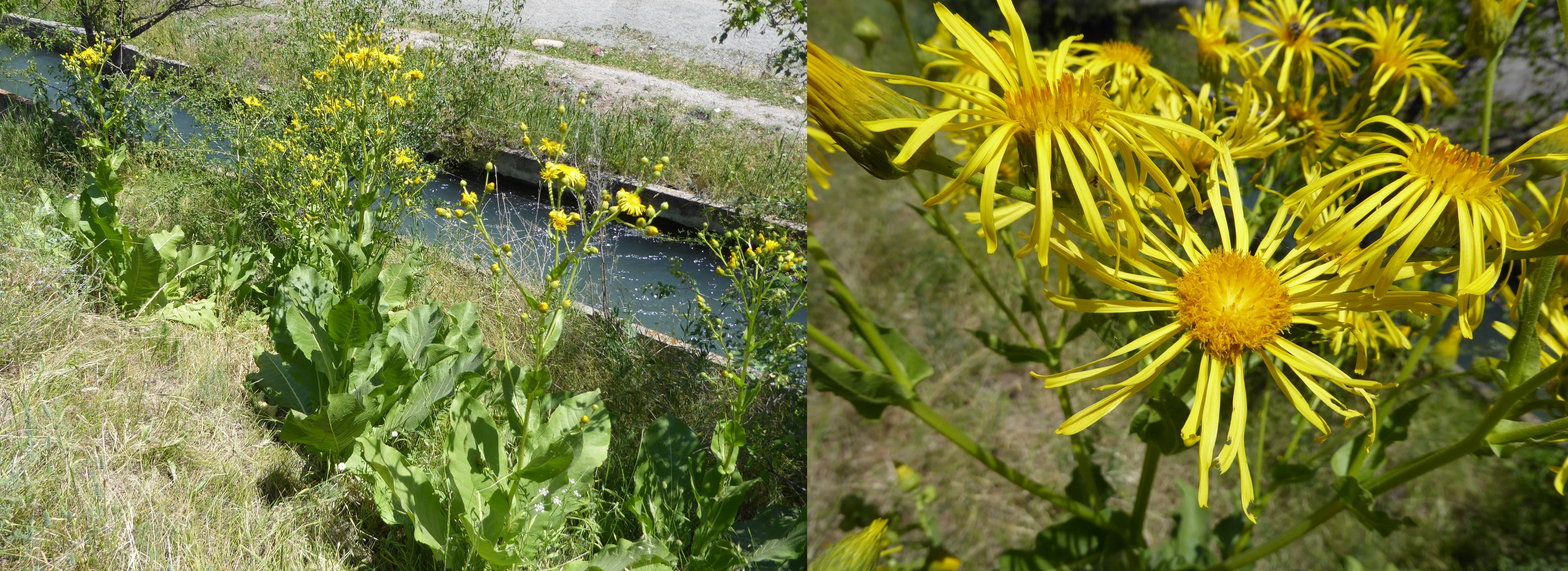 Après Sosnoska nous longeons un canal de dérivation au bord de la route M41. Dans les zones fraîches au bord de ce canal, nous observons la remarquable Inula grandis Schrenk ex Fisch. (planche 4 ; PCPR021668 & PCPR021669), à nombreux capitules de grande taille regroupés en pseudo-ombelles. Elle pousse dans la partie fraîche, comme Acer tataricum L. subsp. semenovii (Regel & Herder) A.E. Murray (207* ; PCPR021942), alors qu’au-dessus, sur la partie steppique du talus, nous revoyons des espèces connues, Aegilops tauschii Coss. (11*), Peganum harmala L., Salvia deserta Schangin (12*), Salvia sclarea L., Roemeria refracta DC. (205*), Handelia trichophylla (Schrenk) Heimerl (16* ; PCPR021969 & PCPR021970) et Sibbaldianthe orientalis (Juz. ex Soják) Mosyakin & Shiyan (29* ; PCPR021960 & PCPR021984).