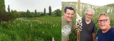 L’arrêt suivant, à une altitude similaire (41° 53′ 52.3″ N, 73° 23′ 13.6″ E) s’impose à nous quand nous tombons sur des prairies couvertes de l’incroyable Eremurus robustus (Regel) Regel (PCPR002688 & PCPR021492). Les hampes de cette espèce dépassent, pour la plupart, deux mètres de hauteur, offrant ici un spectacle rare. Nous ne pouvons résister à une séance de photographies souvenir (planche 52). Cette espèce endémique d’Asie centrale a été décrite dans une revue d’horticulture en 1873, rappelant la grande attractivité des jardiniers pour les Eremurus. Nous les comprenons aisément.