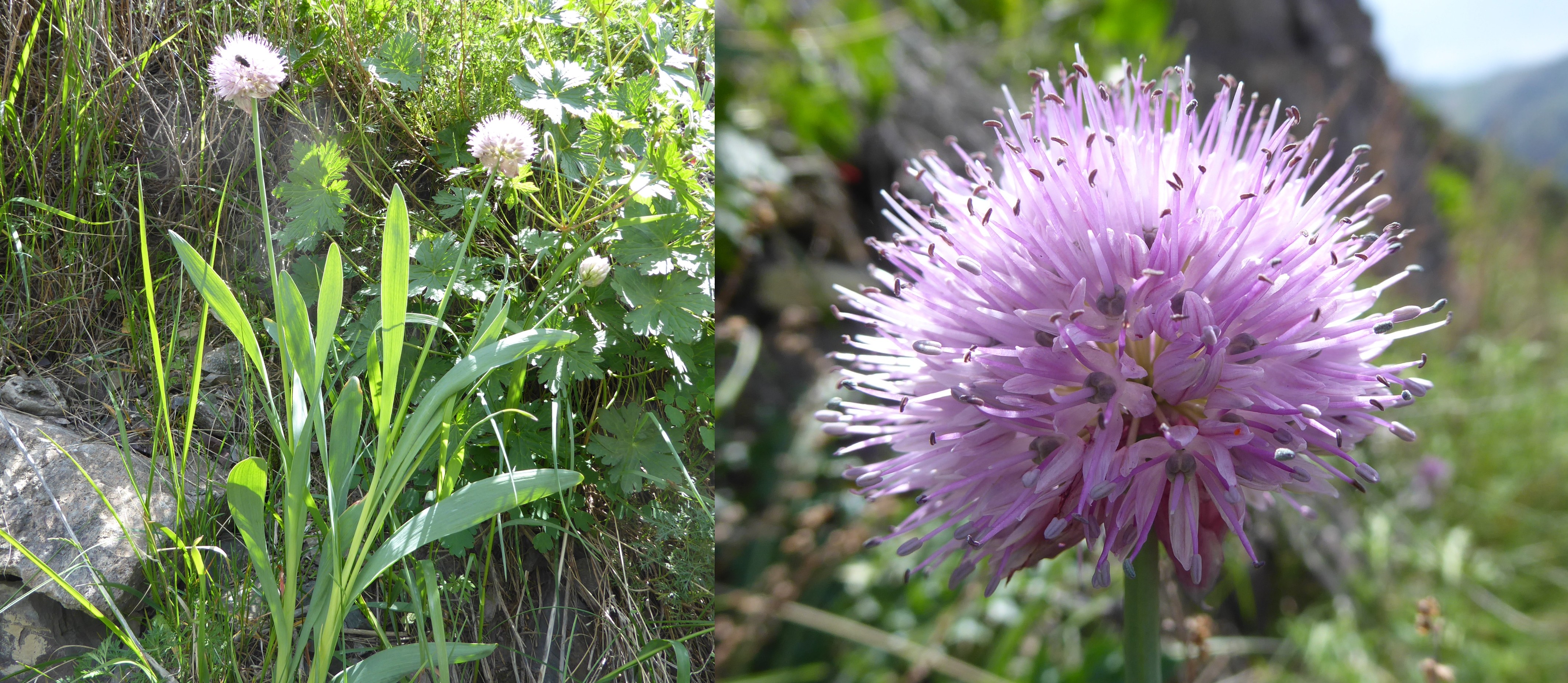 Nous le franchirons en milieu de journée sous un grand soleil et y découvrirons de nombreuses espèces remarquables. Notre premier arrêt est rapide, à mi-montée, pour observer deux espèces très ornementales. La première est Allium platyspathum Schrenk ex Fisch. & C.A. Mey. (planche 8 ; PCPR021468 & PCPR021469), à larges inflorescences roses, spathe courte teintée de rouge, feuilles larges et bulbe allongé (section Rhizidium Don). Le genre Allium est représenté par de nombreuses espèces en Asie centrale. Nous en verrons une dizaine lors du voyage, toutes identifiées non sans difficultés. La deuxième est un Hedysarum de la section Hedysarum, proche de notre H. alpinum L. C’est Hedysarum neglectum Ledeb., autre endémique d’Asie centrale (photo 19 ; PCPR021658 & PCPR021659).