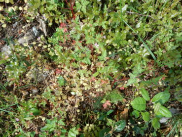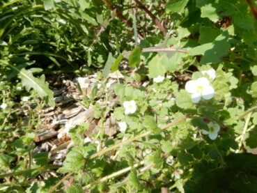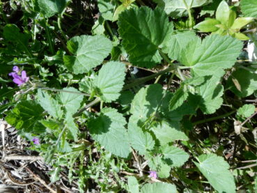 Le tableau 2 rassemble seize relevés d’un premier ourlet surtout étudié entre fin mars et début mai, caractérisé par la combinaison de Geranium purpureum (photo 5), G. rotundifolium, Veronica cymbalaria (photo 6), Galium aparine, Euphorbia peplus, Bromus diandrus, Crepis sancta, Fumaria capreolata, Cardamine hirsuta, Scandix pecten-veneris subsp. p. ; il peut entrer en contact avec une végétation vivace plus ou moins rudérale à Oloptum miliaceum, Dittrichia viscosa subsp. v., Parietaria judaica… Les affinités méditerranéennes de cet ourlet ne sont donc que faiblement exprimées, il semble toutefois assez bien se ranger dans le Valantio muralis-Galion muralis Brullo in Brullo & Marcenò 1985 (de Foucault, 2009), alliance au sein de laquelle il n’a guère d’équivalent déjà connu. On peut le décrire sous le nom nouveau de Veronico cymbalariae-Geranietum purpurei ass. nov. hoc loco, typus nominis hoc loco : relevé 5 du tableau 2 hoc loco, retranscrit ci-dessous :