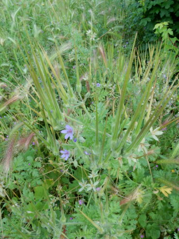 Biologiquement (végétation thérophytique) et phénologiquement (végétation vernale) proche de l’ourlet précédent, mais à développement souvent spatial et non plus linéaire, en outre plus héliophile et plus rudérale, la friche à Erodium ciconium est décrite par les huit relevés du tableau 5. On peut la caractériser par la combinaison de Erodium malacoides (photo 11), E. ciconium (photo 12), Hordeum leporinum subsp. l./subsp. glaucum, Geranium rotundifolium, Carduus pycnocephalus (photo 29), Medicago polymorpha, Calendula arvensis, Diplotaxis erucoides. Au sein des Sisymbrietea officinalis, elle peut se rattacher à l’Hordeion leporini Braun-Blanq. ex Braun-Blanq. et al. 1947 (de Foucault, 2012). La comparaison des colonnes Emc, Hl (Hordeetum leporini, d’après de Foucault, 2012, tableau 4 : colonne 45) et CHl (Carduo pycnocephali-Hordeetum leporini Braun-Blanq. 1936 em. O. Bolòs 1962, d’après Roselló, 1994, tableau 36) du tableau 5 montre que le groupement étudié ici est suffisamment distinct de ces Hordeeta leporini, les associations les plus proches au sein de l’alliance, pour être décrit comme association originale sous le nom de Erodietum ciconio-malacoidis ass. nov. hoc loco, typus nominis hoc loco : relevé 4 du tableau 5 hoc loco, retranscrit ci-dessous :