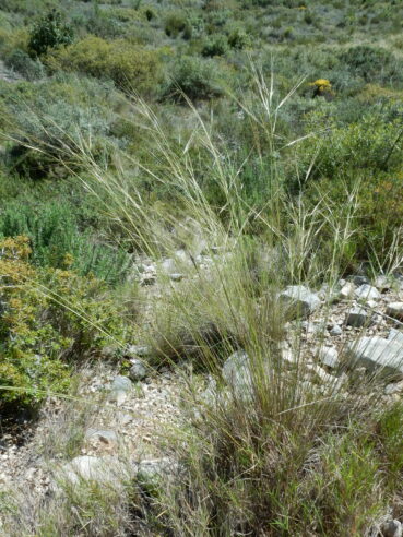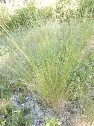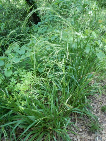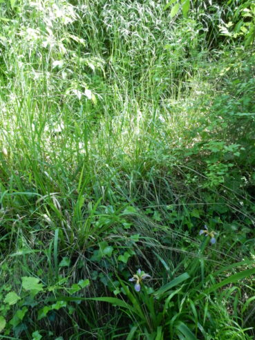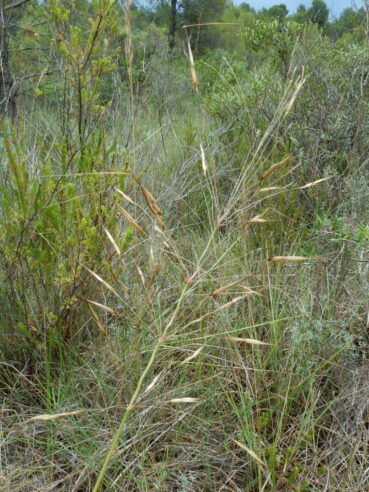 Ces deux types de boisement font apparaître des ourlets vivaces qui partagent notamment Silene italica, Achnatherum bromoides (photo 19), Asparagus acutifolius, Rubia peregrina subsp. p., ainsi que plusieurs formes juvéniles des arbustes du sous-bois. Cette notion d’ourlet préforestier vivace n’était guère connue de J. Braun-Blanquet puisque ce sont surtout les phytosociologues allemands (R. Tüxen, Th. Müller) qui l’ont mis en exergue au début des années 1960. D’abord au voisinage de la ripisylve, c’est un ourlet à Achnatherum paradoxum (photo 20), dont le tableau 7 rassemble neuf relevés (nos 1 à 9) ; assez original, il mérite d’être élevé au rang d’association en tant qu’Irido foetidissimae-Achnatheretum paradoxi ass. nov. hoc loco, typus nominis hoc loco : relevé 1 du tableau 7 hoc loco, repris ci-dessous :