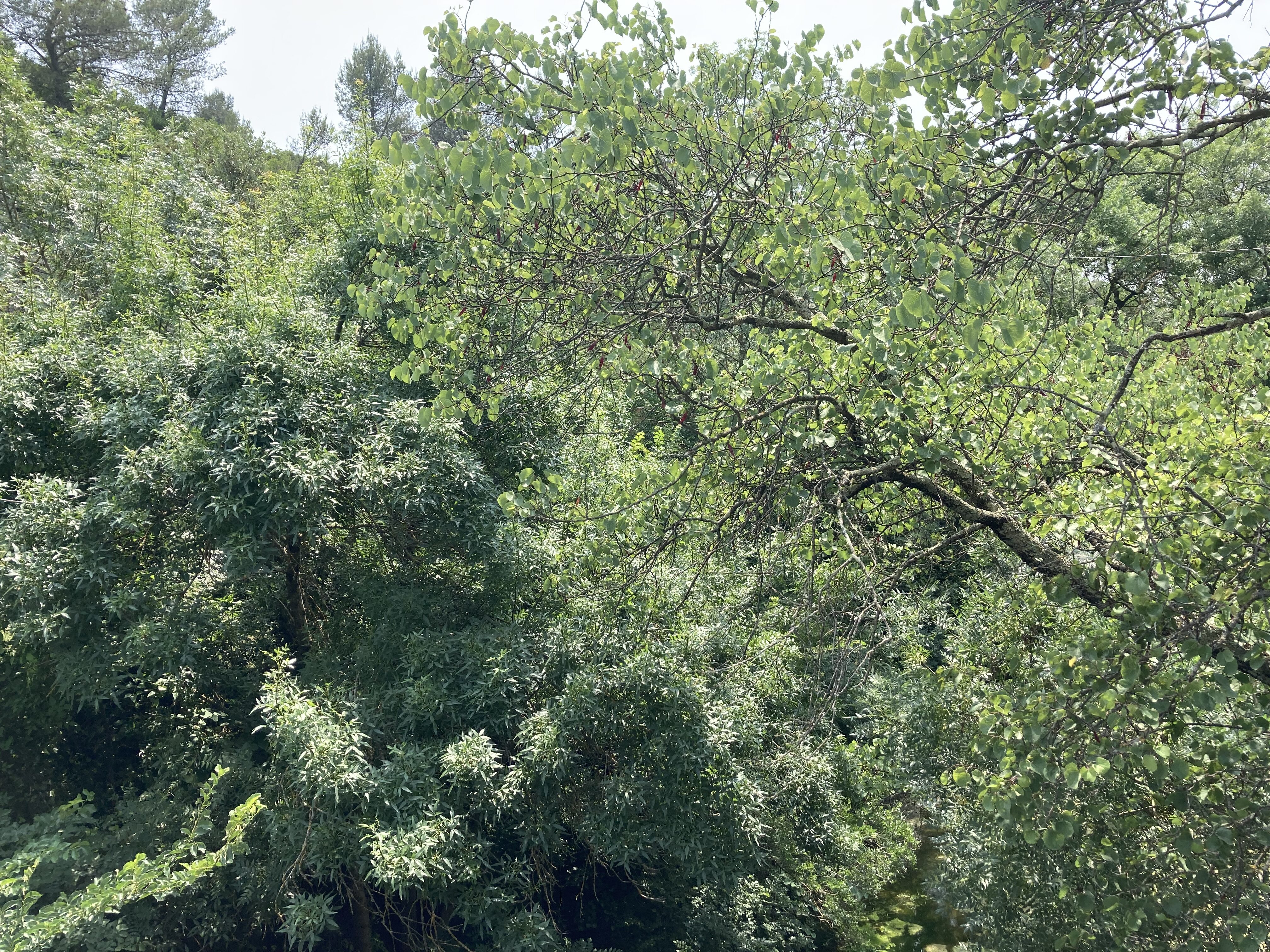 La présence de formes juvéniles de Cercis siliquastrum au sein de l’Irido–Achnatheretum paradoxi montre la potentialité d’un fourré accueillant ce taxon, dont le tableau 8 rapporte quatre relevés. Ces fourrés, sans doute à rattacher au Pruno spinosae-Rubion ulmifolii O. Bolòs 1954, correspondent clairement à un élément des ripisylves locales évoquées par Coulot & Rabaute (à paraître, fiche Cercis siliquastrum, § Habitat – Chorologie – Floraison) dans « le vallon de la Mosson entre Vailhauquès et Combaillaux ». C. siliquastrum peut se développer en arbre et ainsi atteindre la canopée de la ripisylve, s’associant à Fraxinus angustifolia, Ulmus minor, parfois Quercus pubescens, Populus nigra, P. alba (Populo neapolitanae-Fraxinetum angustifoliae (Tchou 1948) B. Foucault & Julve ex B. Foucault & Julve in B. Foucault 2020 ; photo 24).