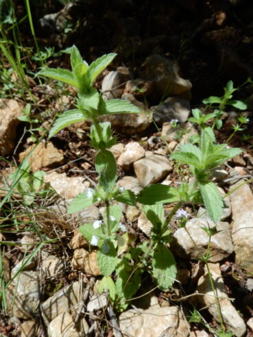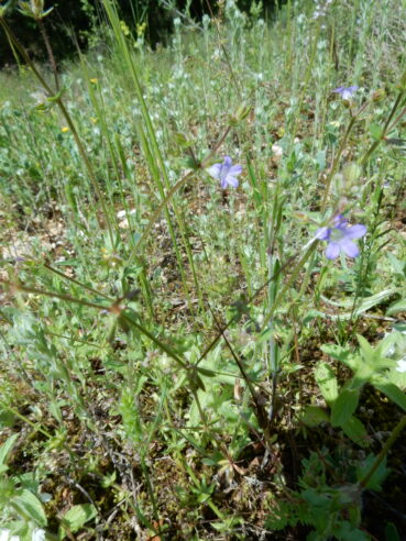 Dans des situations plus naturelles, moins anthropisées, notamment au sein des garrigues à Quercus coccifera, il existe un second type d’ourlet thérophytique vernal à Geranium purpureum, mais aussi avec G. columbinum (photo 8), Centranthus calcitrapae (photo 9)…, dont le tableau 4 rapporte neuf relevés. Avec G. columbinum, il rappelle un peu le Geranietum lucido-columbini décrit de Basse-Normandie (de Foucault, 1989) et le Geranio columbini-Sedetum cepaeae décrit du Limousin (Mady et al., 2019). Ici la tonalité méditerranéenne est cependant plus marquée. On peut définir le Geranietum columbino-purpurei ass. nov. hoc loco, typus nominis hoc loco : relevé 5 du tableau 4 hoc loco (photo 10).