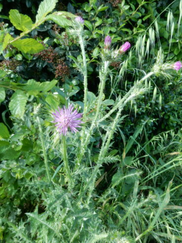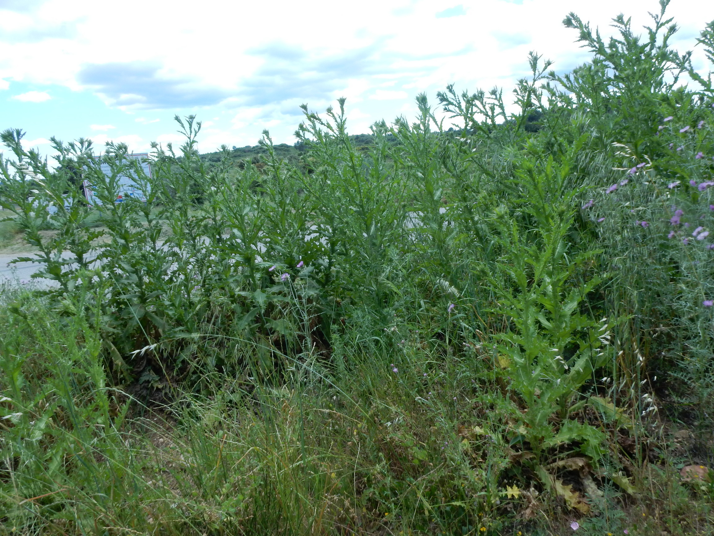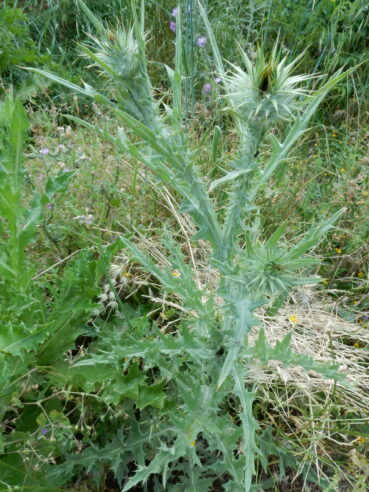 Dans la végétation locale, on peut encore rencontrer la haute friche armée par de grands « chardons » annuels à bisannuels (en fait des Asteraceae Cardueae ou plutôt maintenant Cynareae), surtout Carduus pycnocephalus (photo 30), C. nigrescens subsp. vivariensis (photo 31), Tyrimnus leucographus (photo 32), Silybum marianum, Carthamus lanatus, Onopordon illyricum (photo 33), O. tauricum (photo 34), auxquels on peut ajouter Galactites tomentosus peu présent dans le tableau 10 qui en rassemble onze relevés. La comparaison avec la liste synthétique de Soroceanu (1936, tableau 51 p. 200, repris en colonne S dans ce tableau 10) fait apparaître des différences floristiques à presqu’un siècle de distance : Galactites tomentosus, Cynoglossum cheirifolium, Carduus tenuiflorus en 1936, Hordeum murinum subsp. leporinum/glaucum, Carduus pycnocephalus, Onopordum tauricum, Avena barbata aujourd’hui. Quoi qu’il en soit, c’est à l’Onopordetum illyrici Braun-Blanq. ex Soroceanu 1936 (photo 35) qu’il faut rattacher le groupement décrit dans ce tableau 10, malgré la faible représentation du taxon éponyme, peut-être en concurrence avec O. tauricum.