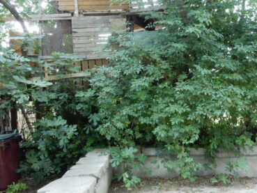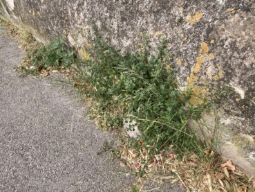 Bien souvent, en ville, un trottoir plus ou moins horizontal entre en contact avec un mur plus ou moins vertical, la jonction des deux étant souvent imparfaite, surtout dans les quartiers un peu anciens, de sorte que l’espace résultant peut être colonisé par une végétation annuelle ou vivace rudérale. C’est ainsi que l’on peut y observer une « friche vivace chasmophytique » où les Dittrichietea viscosae (classe de végétation vivace rudérale méditerranéenne) rencontrent les Parietarietea judaicae (classe de végétation vivace chasmophytique rudérale), où Oloptum miliaceum s’associe à Parietaria judaica (photo 36) ; le tableau 11 en rapporte treize relevés : Olopto miliacei-Parietarietum judaicae ass. nov. hoc loco, typus nominis hoc loco : relevé 3 du tableau 11 hoc loco, accueillant en moyenne près de six taxons par relevé, à rattacher au Centrantho-Parietarion judaicae Rivas Mart. 1969, au sein des Parietarietea judaicae.