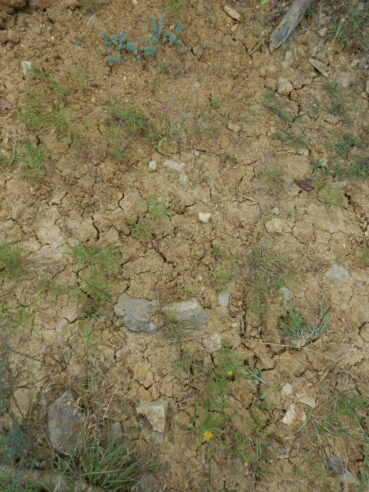 Il faut encore évoquer les rares petites pelouses à Sideritis romana, Xeranthemum inapertum, Neastostema apulum, Campanula erinus (photos 25 à 28) et surtout Medicago minima, Catapodium rigidum, Filago pyramidata, Malva setigera, Petrorhagia prolifera…, dont le tableau 9 rassemble cinq relevés. Relevant clairement du Brachypodion distachyi Rivas Mart. ex Rivas Mart. et al. 1999, cette pelouse (photo 29) est encore trop incomplètement caractérisée pour donner lieu à une interprétation synsystématique. On remarque que son eutrophisation, surtout dans le relevé 5, permet l’arrivée de taxons des friches thermophiles de l’Onopordion illyrici, dont la description fait l’objet du paragraphe suivant.