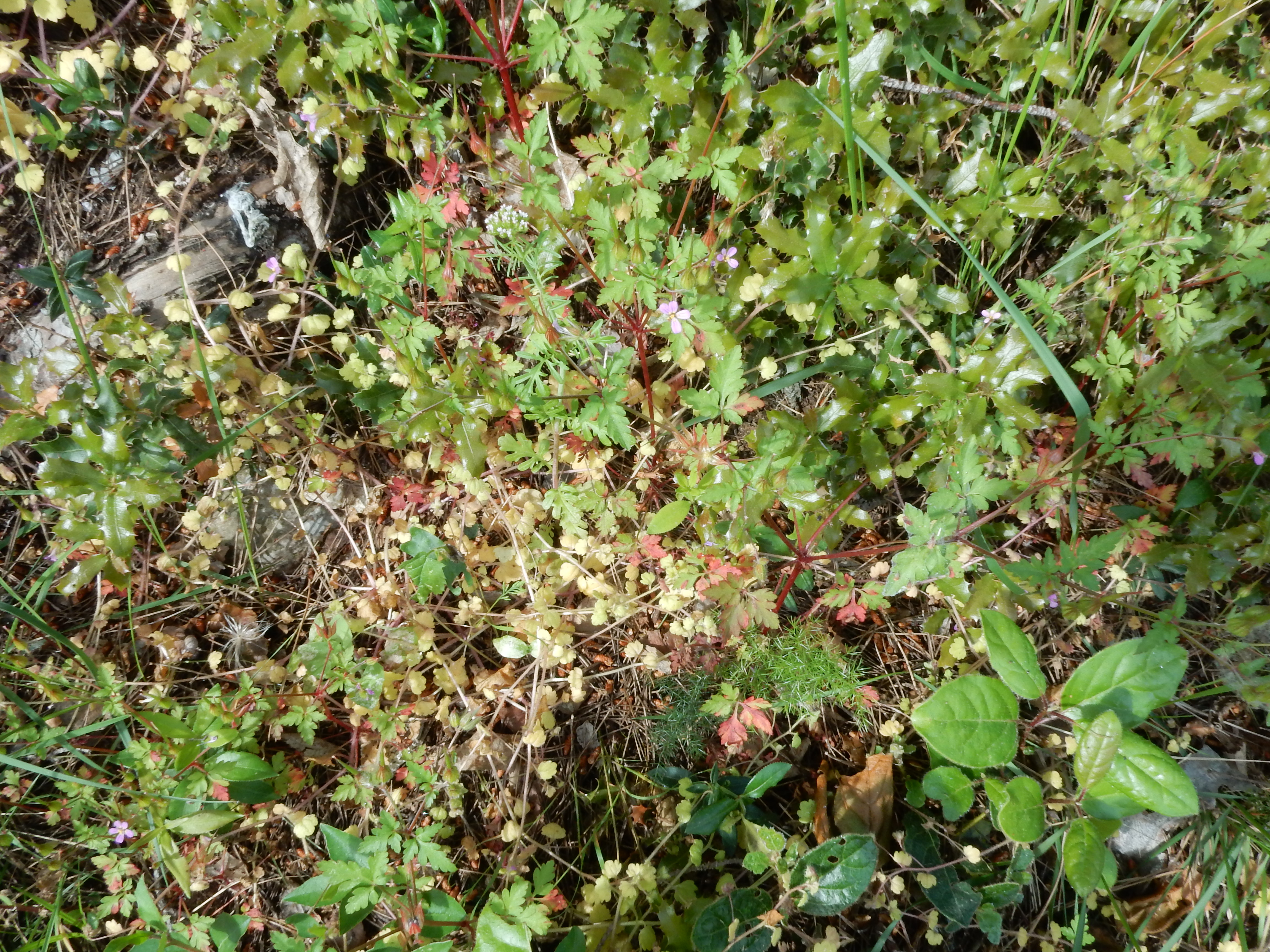 - Valantio-Galion muralis et unités supérieures : Geranium purpureum 4, Galium aparine 3, Geranium rotundifolium 2, Bromus diandrus 2, Veronica cymbalaria 1, Euphorbia peplus 1, Fumaria capreolata 1, Scandix pecten-veneris *p. +,